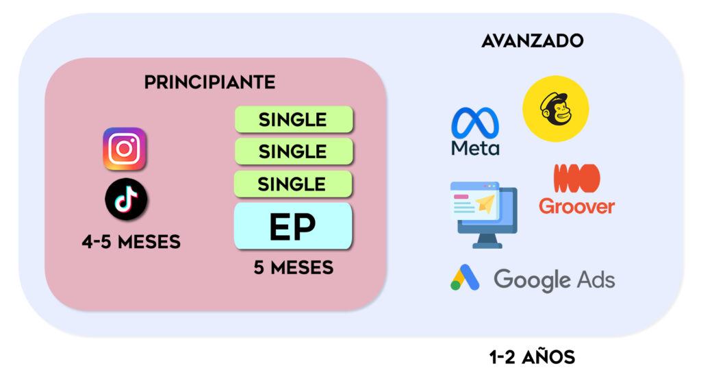 Queda claro que el ciclo en general de esta estrategia puede durar hasta unos 5 meses promedio para los 4 lanzamientos incluyendo el EP, más los meses de presentación previa. En total podés estar alrededor de 1 año si luego del EP incluso querés sumar algo más, tanto en lanzamientos como en promoción hasta cerrar el ciclo e iniciar uno nuevo.