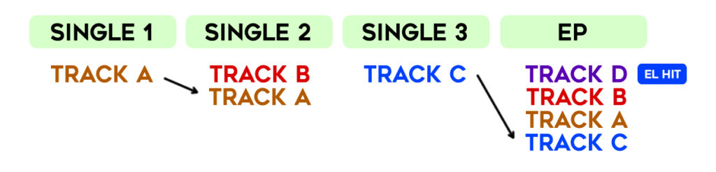 Pasaron los 4 meses promedio y ya tenés toda la data de las canciones que gustan, que las vas a ordenar al revés cuando las vayas a lanzar. La más popular o la que más pasta y éxito tiene, vas a lanzarla última con un videoclip. El EP de 4 canciones va a contener la canción más exitosa junto a las otras ya lanzadas anteriormente. Ese es el hype que vamos a emplear, hasta el límite.