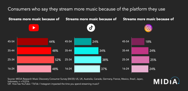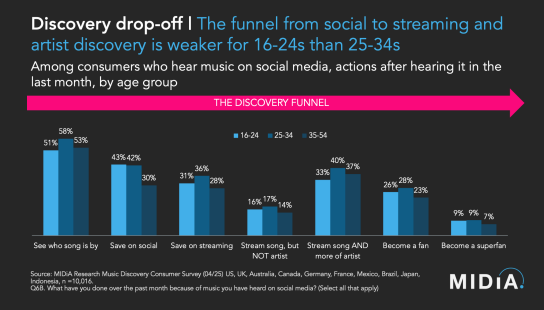 El informe de MIDiA llama a esto “el colapso del embudo social”. El 48% de los usuarios que escuchan una canción en redes no la vuelven a reproducir en plataformas de streaming. Y menos del 30% se convierte en fan. Eso sucede porque el público más joven (de 16 a 24 años) ya no busca música, la música simplemente les aparece.