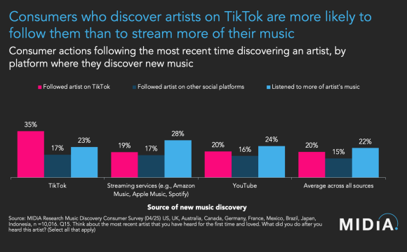 El estudio revela que solo el 26% de quienes siguen a un artista en TikTok escuchan más música de ese artista. No es que el número sea malo, pero en otras redes ese porcentaje sube al 45% y son números que tenemos que tener en cuenta porque la gente se esfuerza demasiado en TikTok.